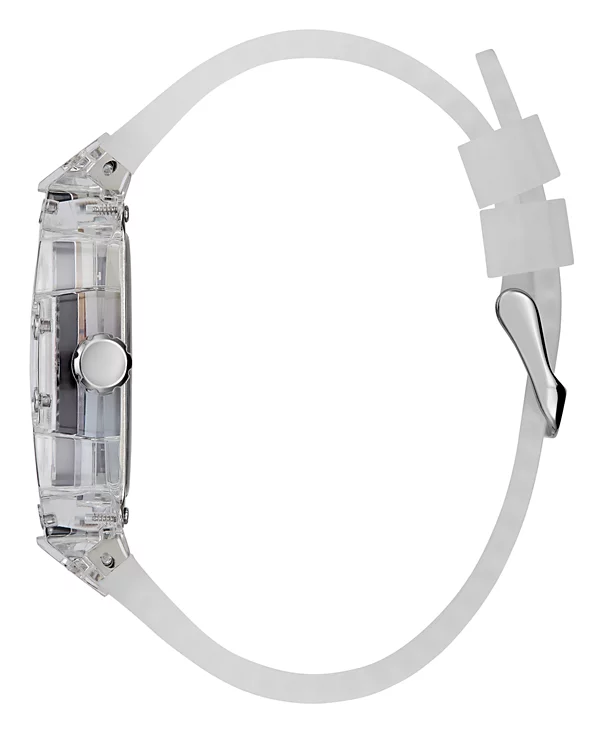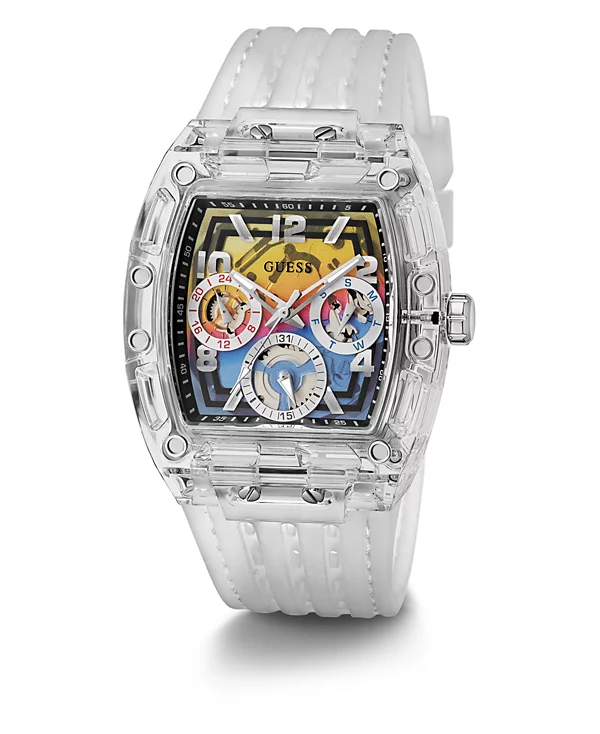 Guess-Men’s Watch Skeleton dial details keep this phoenix on the rise. This style features a polycarbonate cut-through barrel shaped case with screw details and a cut-through multi-function ombre rainbow colored dial paired with a silicone strap. Style# PID- GW0499G3.